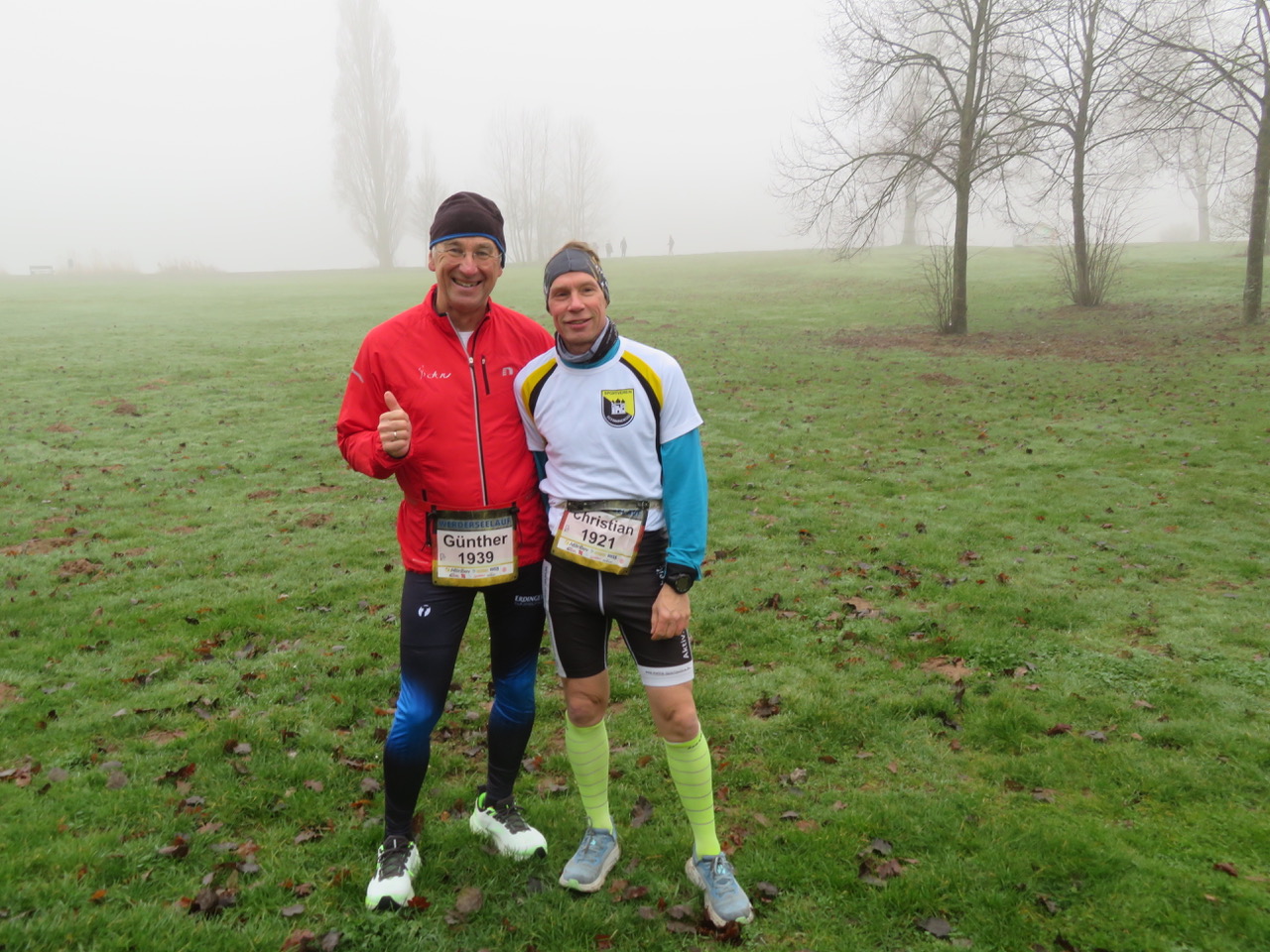 Für Günther und Christian ging es vorrangig nicht um irgendwelche Bestleistungen. Wir wollten Beide gut durchkommen und es quasi als sehr langen Trainingslauf ansehen. Bei gefühlten 7/8 Grad ging es 8.45 auf die 8,333km langen Runde. Nach und nach verzog sich auch der Nebel, so dass man auf der gegenüberliegenden Seite des Rundkurs das Teilnehmerfeld sehen konnte. Die Strecke war eigentlich flach, auch wenn es galt zweimal unter einer Brückenunterführung durchzulaufen.