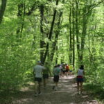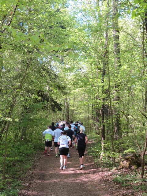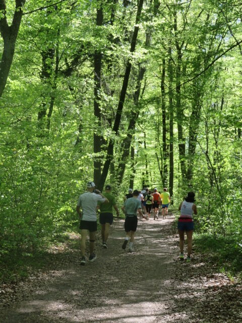 Danach ging es über Waldwege in leuchtendem Grün und gut beschattet durch die herrliche Natur, begleitet von Vogelgezwitscher. Einfach traumhaft. Allerdings galt es die Augen stets aufmerksam am Boden zu haben – die Strecke war immer wieder mit kleineren Steinen und Wurzeln bestückt, was auch zu einigen Stürzen und beinahe Stürzen führte. Und auch wenn der Kurs pro Runde nur 30 Höhenmeter hatte, kostete der Untergrund mit der Zeit einiges an Kraft.